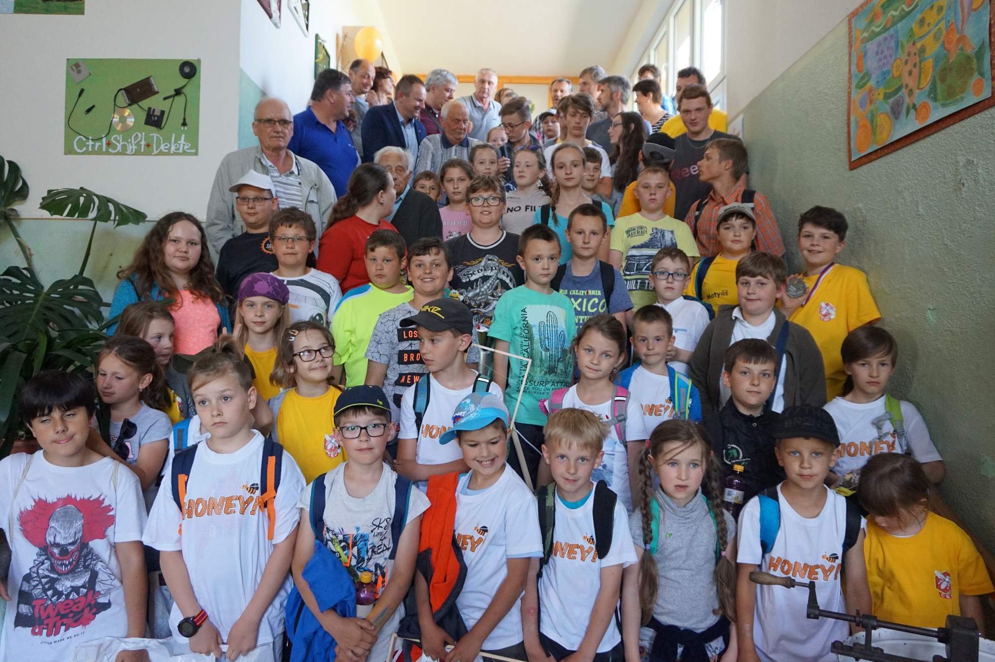 Humlík oběma vítězkám gratuluje a protože rád mlsá med, odměnil všechny soutěžící dárkovými taškami.