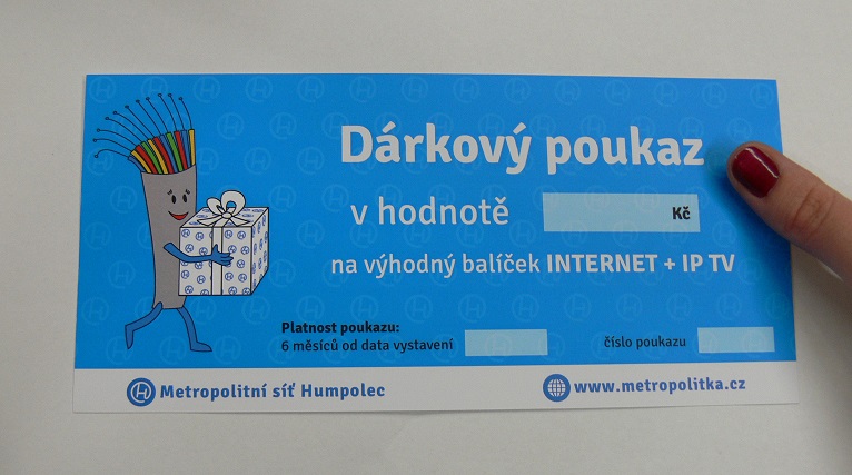V nabídce máme samozřejmě i poukazy na naše služby a to na INTERNET i IPTV – můžete tak svým blízkým ušetřit nějakou tu korunu a služby jim předplatit klidně na celý rok!